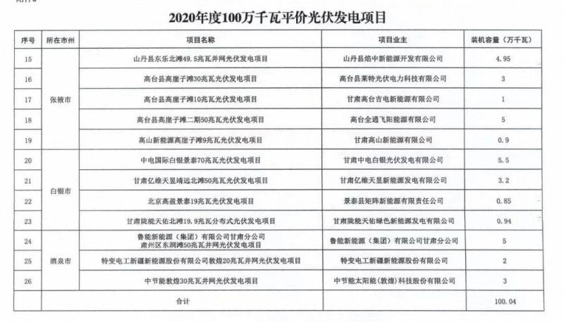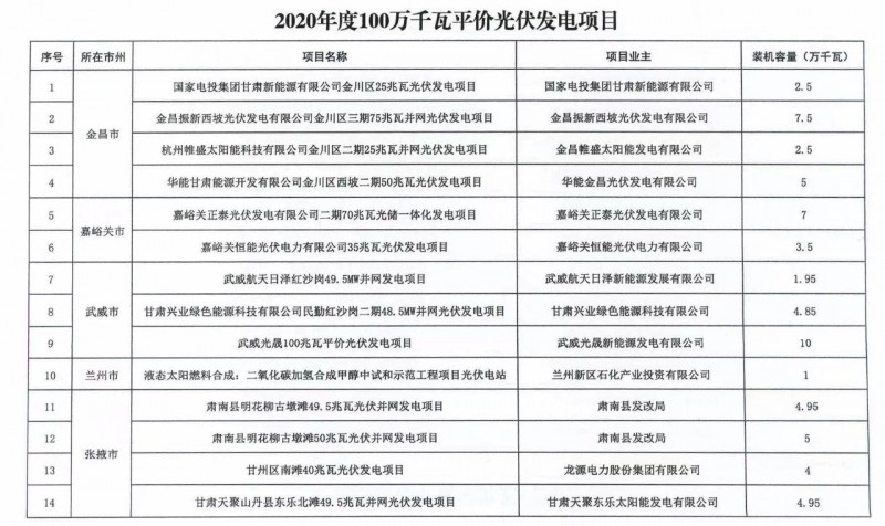 3月25日,甘肅省發(fā)改委發(fā)布《關于加快推進全省新能源存量項目建設工作》的通知。文件明確,甘肅省目前新能源存量項目約600萬千瓦。其中,光伏發(fā)電項目1.23GW包括:酒湖直流工程配套23.5萬千瓦光伏發(fā)電項目以及《國家發(fā)展改革委辦公廳國家能源局綜合司關于公布2020年風電、光伏發(fā)電平價上網項目的通知》(發(fā)改辦能源〔2020〕588號)中尚未并網100萬千瓦光伏發(fā)電項目。