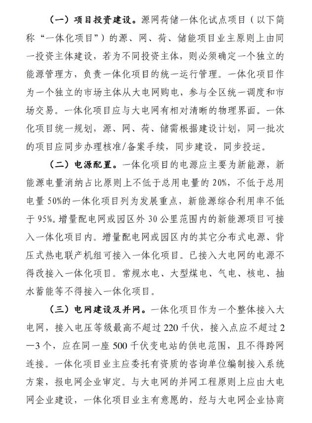 征求意見(jiàn)稿中關(guān)于園區(qū)(居民區(qū))級(jí)源網(wǎng)荷儲(chǔ)一體化試點(diǎn)要求中明確:一體化項(xiàng)目的電源配置為不低于總電量20%的新能源,其中不低于總用電量的50%的一體化項(xiàng)目列為重點(diǎn)發(fā)展,新能源綜合利用率不低于95%;儲(chǔ)能配置上要求不低于總裝機(jī)容量的15%、時(shí)長(zhǎng)2小時(shí),并能滿足削減一體化項(xiàng)目 5%高峰用電負(fù)荷的要求。