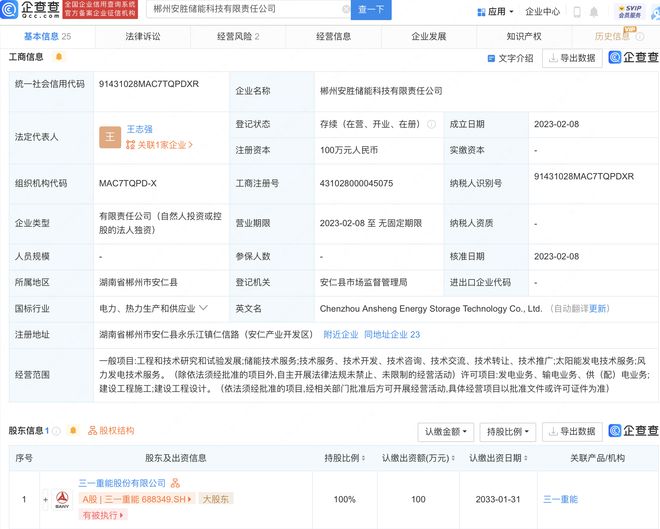 近日,郴州安勝儲(chǔ)能科技有限責(zé)任公司成立,法定代表人為王志強(qiáng),注冊資本100萬元人民幣,經(jīng)營范圍包含:儲(chǔ)能技術(shù)服務(wù);太陽能發(fā)電技術(shù)服務(wù);風(fēng)力發(fā)電技術(shù)服務(wù)等。企查查股權(quán)穿透顯示,該公司由三一重能100%控股。