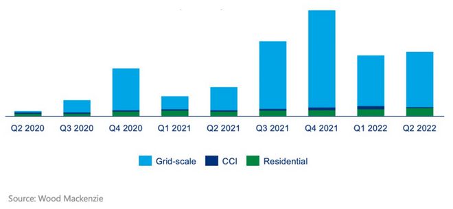 2020年及2021年美國(guó)儲(chǔ)能裝機(jī)量分別達(dá)到3529/10499MW,增長(zhǎng)率237%/198%。根據(jù)WoodMackenzie與美國(guó)清潔能源協(xié)會(huì)聯(lián)合發(fā)布的研究報(bào)告顯示,2022年上半年,美國(guó)儲(chǔ)能市場(chǎng)裝機(jī)容量2305MW/5917MWh,其中22Q2電網(wǎng)級(jí)儲(chǔ)能安裝容量達(dá)到1,170 MW/2,608 MWh, 是有史以來第二季度的最高裝機(jī)容量 。
