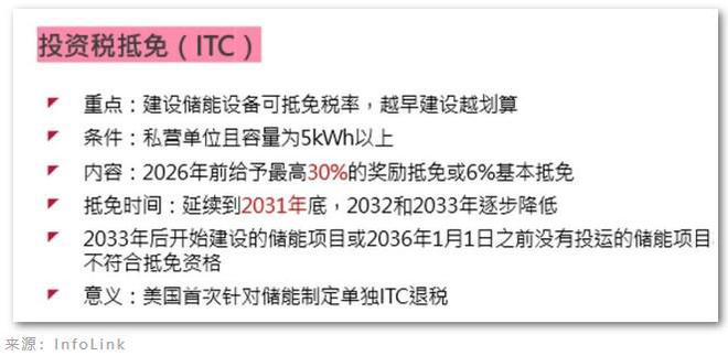 對(duì)于儲(chǔ)能來(lái)說(shuō),這是美國(guó)首次針對(duì)獨(dú)立儲(chǔ)能進(jìn)行投資稅抵免(Investment Tax Credit, ITC)。