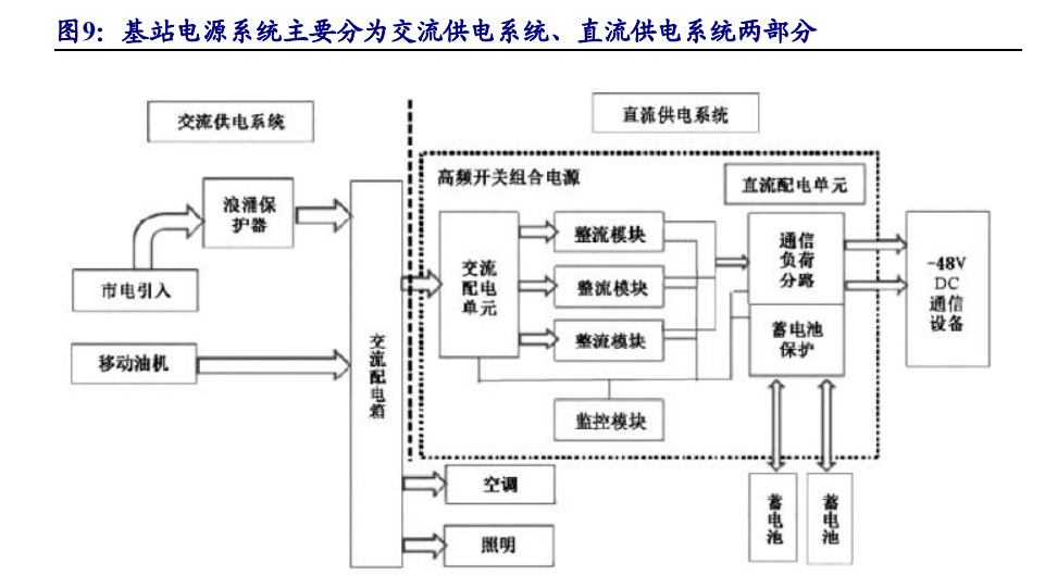 通信儲能作為通信基站的配套基礎(chǔ)設(shè)施,是保障通信系統(tǒng)實現(xiàn)可靠運行的關(guān)鍵。 開年以來,北京、上海、深圳、寧夏、大連、吉林等省市宣布 5G 基站建設(shè)目標(biāo),1 月 31 日,北京宣布將在 2023 年新建 1 萬個以上 5G 基站;2 月 8 日,寧夏宣布將在 2023 年新建 5G 基站 2000 個,累計達(dá)到 13000 個;2 月 11 日,上海計劃 2023 年新 建 1 萬個 5G 基站;2 月 10 日,深圳市工信局發(fā)布《深圳市極速先鋒城市建設(shè)行動 計劃》,計劃指出要全面提升 5G 網(wǎng)絡(luò)能效,全年新增 5G 基站 10000 個。2 月 13 日, 吉林省通信管理局公布 5G 基站相關(guān)數(shù)據(jù):2022 年建成 5G 基站 13042 個,累計建成 5G 基站 34092 個,并宣布了 2023 年目標(biāo):力爭新建 5G 基站 8000 個。2 月 14 日, 大連市通信管理局宣布全年全域?qū)⑿陆?5G 基站 4000 個以上,力爭年底建成 19000 個 5G 基站,重點場所網(wǎng)絡(luò)通達(dá)率提升至 99%。 我國 5G 基站的建設(shè)運營模式主要采用中國鐵塔建塔、引電建設(shè)基礎(chǔ)配套設(shè)施, 移動、聯(lián)通、電信三大主運營商租塔、安裝設(shè)備并進(jìn)行網(wǎng)絡(luò)運營的模式,運營電費 由鐵塔代運營商統(tǒng)一向電力部門繳納。5G 基站開通后電費成本開支已高于鐵塔租費, 較大的 5G 基站耗電量已經(jīng)成為阻礙 5G 和制約行業(yè)發(fā)展的一個重要因素。利用儲能 裝置在負(fù)荷高峰時期放電,負(fù)荷低谷時期從電網(wǎng)充電,減少高峰負(fù)荷需求,節(jié)省用電費用,從而達(dá)到改善負(fù)荷特性、參與系統(tǒng)調(diào)峰的目的,同時節(jié)省電費、最大限度 套利。 基站電源系統(tǒng)主要分為交流供電系統(tǒng)、直流供電系統(tǒng)兩部分。交流供電系統(tǒng)包 含市電引入、移動油機、浪涌保護(hù)器、交流配電箱等。直流供電系統(tǒng)包含高頻開關(guān) 組合電源,蓄電池等。