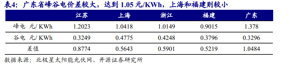 目前儲能站盈利模式的其中一類是采取峰谷電價套利模式,即儲能站在谷時充 電,峰時放電,以此補平電網(wǎng)負(fù)荷曲線的同時獲取峰谷電價差值的收益。 參考 2023 年各省電網(wǎng)企業(yè)代理購電價格來看,江蘇、上海、浙江、福建、廣東 等省為代表性較強的省份,選取谷時和高峰時段電價進(jìn)行比較,上海和福建的峰谷 電價差值較小,僅為 0.56 元、0.52 元/KWh,而廣東則價差較大,達(dá)到 1.05 元/KWh。