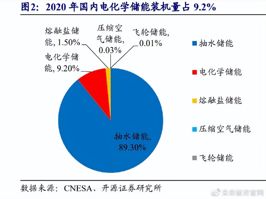 從儲能方式來看,抽水儲能為目前國內(nèi)累計裝機規(guī)模最大的蓄能方式,占比達(dá) 到了 89.3%;其次是電化學(xué)儲能,裝機規(guī)模占比為 9.2%。熔融鹽儲熱裝機規(guī)模占比為1.5%;壓縮空氣儲能和飛輪儲能裝機規(guī)模占比都小于 0.1%。電化學(xué)儲能中,鋰電池仍 為主導(dǎo)儲能形式,占總量 88.8%,鉛蓄電池為第二大分支,占到 10.2%。