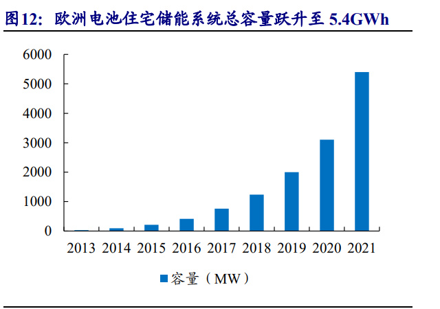 歐洲光伏產(chǎn)業(yè)協(xié)會(SolarPower Europe)數(shù)據(jù)表明,歐洲部署的住宅儲能系統(tǒng)總儲能容量在 2020 年首次突破 1GWh,而在 2021 年又增長了一倍多,達(dá)到 2.3GWh。 2021 年住宅電池儲能市場的規(guī)模是 2014 年的 35 倍。歐盟各國在 2014 年僅安裝了約 9000 套住宅電池儲能系統(tǒng),而到 2021 年,約部署了 26 萬套住宅電池儲能系統(tǒng)。歐 洲光伏產(chǎn)業(yè)協(xié)會在其“中等情景”預(yù)計 2022 年將達(dá)到 3.9GWh,將增長 71%,這將 使歐洲累計部署的住宅儲能系統(tǒng)總儲能容量達(dá)到 9.3GWh。根據(jù)該協(xié)會的預(yù)計,歐洲 在 2022 年將安裝 42 萬多塊蓄電池,這將使歐洲 100 多萬戶家庭使用住宅太陽能發(fā) 電設(shè)施和住宅電池儲能系統(tǒng)。歐洲電池儲能系統(tǒng)的電池通常是進(jìn)口的,現(xiàn)在面臨著 嚴(yán)重短缺的困境。 歐洲光伏產(chǎn)業(yè)協(xié)會認(rèn)為,住宅太陽能和儲能系統(tǒng)的部署熱潮將會持續(xù)下去。根 據(jù)該協(xié)會對“中等情景”的預(yù)計,到 2026 年底,歐洲將有 390 萬戶家庭部署住宅電 池儲能系統(tǒng),累計部署的儲能容量將增長 300%以上,達(dá)到 32.2GWh。而其“高等情 景”預(yù)測超過 44GWh。德國是在歐洲領(lǐng)先的住宅電池儲能市場 (2021 年占?xì)W洲住宅 電池儲能市場份額的 59%),新建的住宅太陽能設(shè)施的電池儲能系統(tǒng)配套部署率達(dá)到 70%,并且還在進(jìn)一步上升。