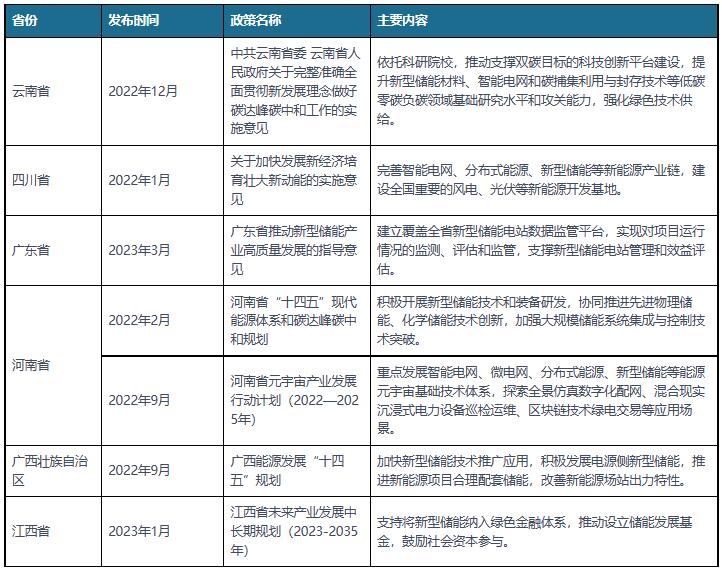我國各省市也積極響應(yīng)國家政策規(guī)劃,對各省市新型儲能行業(yè)的發(fā)展做出了具體規(guī)劃,支持當(dāng)?shù)匦滦蛢δ苄袠I(yè)穩(wěn)定發(fā)展,比如四川省發(fā)布的《關(guān)于加快發(fā)展新經(jīng)濟(jì)培育壯大新動能的實(shí)施意見》提出完善智能電網(wǎng)、分布式能源、新型儲能等新能源產(chǎn)業(yè)鏈,建設(shè)全國重要的風(fēng)電、光伏等新能源開發(fā)基地。