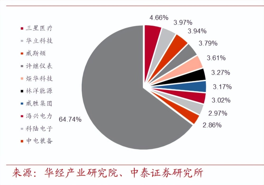 智能電表行業(yè)處于充分競爭狀態(tài),市占率穩(wěn)定。參與智能電表及用電信 息集中采集招標的企業(yè)數(shù)量較多,國家電網智能電表及用電信息采集系 統(tǒng)招標入圍公司已超過百家,集中度較低,第一梯隊三星醫(yī)療、東方威 斯頓、許繼電氣、炬華科技市占率維持在 3%-5%左右。長期來看,市場 訂單分散,我國智能電表行業(yè)競爭格局趨于穩(wěn)定。在 2022 年第一批智 能電表中標中,三星醫(yī)療、東方威思頓、科陸電子、許繼、華立科技分 別占比 5.1%、4.8%、4.1%、4.1%、4.1%,其中,科陸電子中標份額 較 2021 年有較大提升。