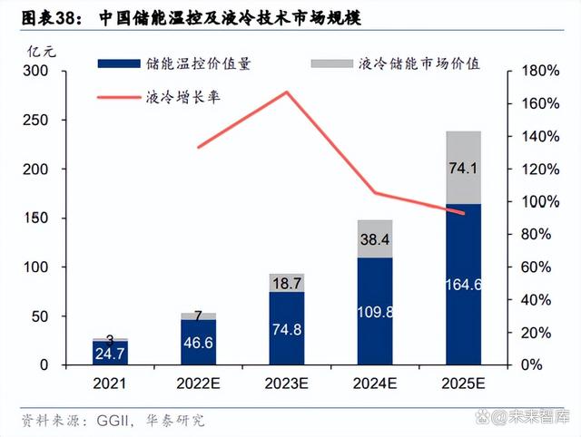 液冷針對(duì)大儲(chǔ)優(yōu)勢(shì)凸顯,未來市場規(guī)模將快速提升。液冷在技術(shù)上具備優(yōu)勢(shì),當(dāng)前大容量、 高功率儲(chǔ)能系統(tǒng)的快速應(yīng)用,對(duì)于儲(chǔ)能系統(tǒng)散熱效率要求更高。液冷技術(shù)相比于傳統(tǒng)風(fēng)冷 散熱效率更高,同時(shí)噪音更小、能耗更低,具有顯著優(yōu)勢(shì),單位價(jià)值量相比風(fēng)冷也會(huì)有明 顯提升。隨著儲(chǔ)能電站大型化、集約化的不斷發(fā)展,儲(chǔ)能系統(tǒng)大容量、高密度的趨勢(shì)不斷 凸顯,未來液冷市場規(guī)模預(yù)計(jì)會(huì)快速增長。根據(jù) GGII,2021 年中國儲(chǔ)能溫控市場整體規(guī)模 為 24.7 億元,液冷溫控市場規(guī)模 3 億元。GGII 預(yù)計(jì)到 2025 年,中國儲(chǔ)能溫控市場總規(guī)模 將達(dá)到 164.6 億元,液冷儲(chǔ)能市場價(jià)值將達(dá)到 74.1 億元,占比約 45.1%,年復(fù)合增長率超 過 89%。