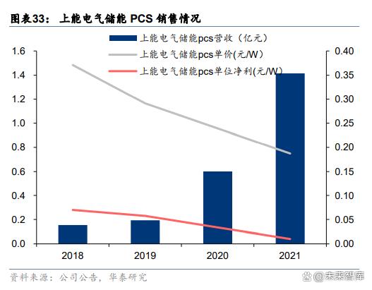 大儲(chǔ)是 B 端市場,廠商價(jià)格直面競爭,產(chǎn)品優(yōu)勢(shì)公司脫穎而出。儲(chǔ)能 PCS 在初期單價(jià)和毛 利率較高,隨著頭部廠商不斷擴(kuò)產(chǎn)和新的廠商不斷進(jìn)入,產(chǎn)業(yè)競爭加劇,價(jià)格和毛利率逐 漸走低。上能電氣 2018 年儲(chǔ)能 PCS 營收 0.15 億元,產(chǎn)品單價(jià) 0.37 元/W,2022 年儲(chǔ)能 PCS 營收 1.42 億元,較 2018 年增長近 9 倍,產(chǎn)品單價(jià) 0.19 元/W,降幅 50%,規(guī)模效應(yīng) 盡顯。陽光電源光伏逆變器價(jià)格穩(wěn)中有降,由 2018 年 0.22 元/W 降至 2022 年 0.19 元/W。