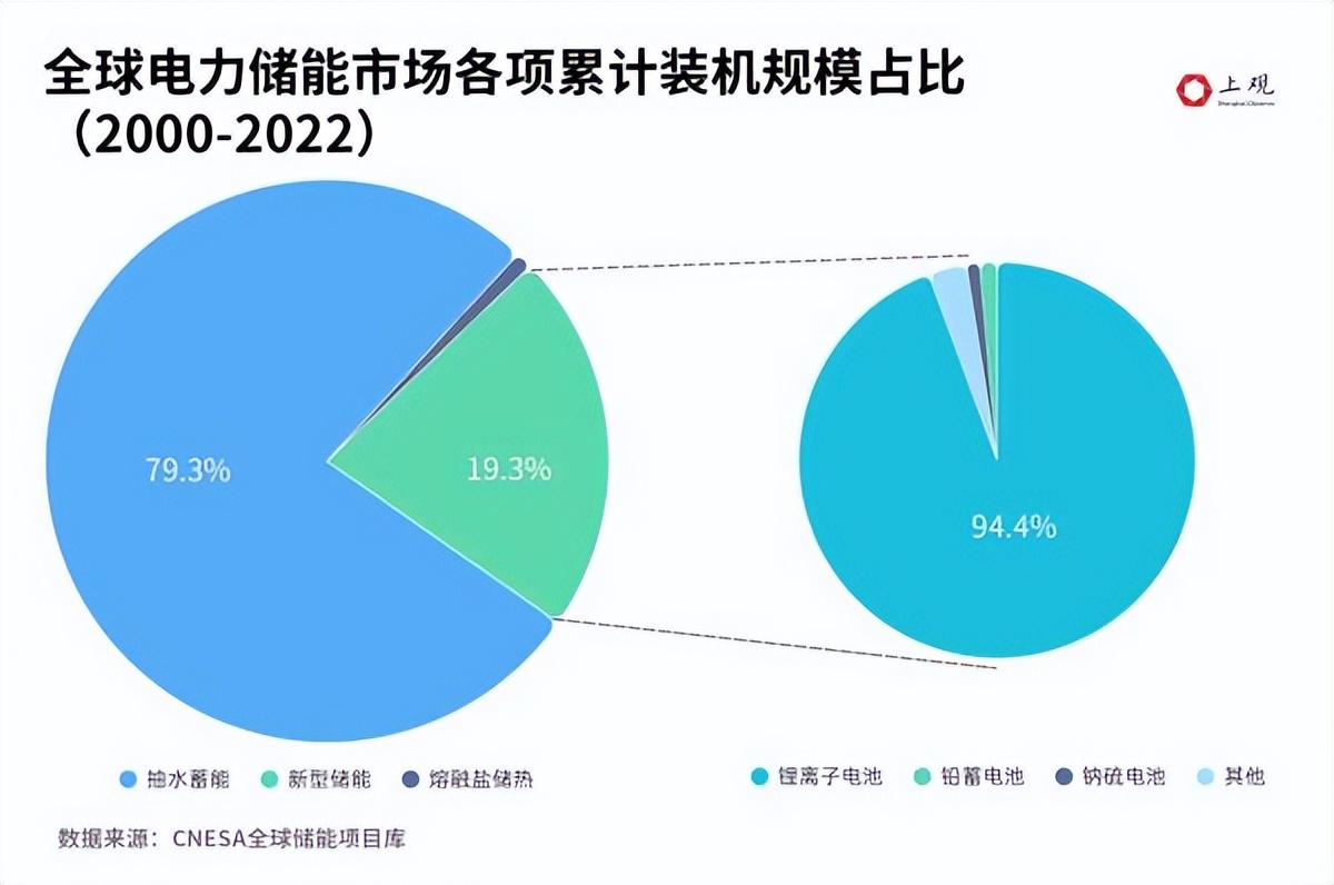 傳統(tǒng)儲能產(chǎn)業(yè)大多利用水勢高低差進行抽水蓄能,這也是目前全球儲能的主要方式,占比近八成。但抽水蓄能受地理資源約束明顯,一般只能建造在山區(qū)與丘陵地帶,且建造成本高、時間長。隨著新能源產(chǎn)業(yè)的不斷發(fā)展,以鋰電池儲能為代表的新型儲能產(chǎn)品技術(shù)逐漸成熟、成本下降,迎來了大規(guī)模商業(yè)化的時機。