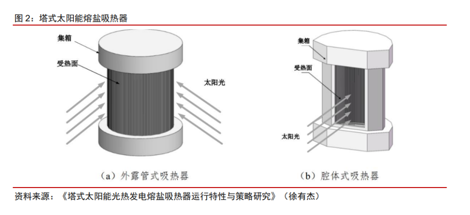 在光熱電站中,吸熱裝置主要作為中間環(huán)節(jié)收集聚光系統(tǒng)產生的熱能,并利用導熱工 質將熱能轉送至蓄熱系統(tǒng)。