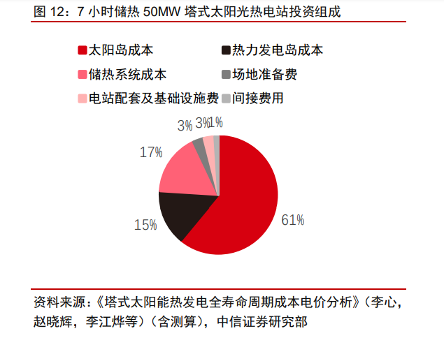 塔式太陽能熱電站中太陽島建設成本是電站建設的主要成本。太陽能熱發(fā)電站建造成 本主要分設備費、安裝費和土建費三部分。綜合《塔式太陽能熱發(fā)電全壽命周期成本電價 分析》(李心,趙曉輝,李江燁等著)的測算數(shù)據(jù)來看,對于 10MW 以上的塔式太陽能熱 發(fā)電站而言,太陽島(含聚光系統(tǒng)和吸熱系統(tǒng))成本占電站建造成本的 55%以上;以 50MW 塔式太陽能熱發(fā)電電站為例,其太陽島成本高達 61%,熱力發(fā)電島(含熱力系統(tǒng)及輔機設 備、水循環(huán)、水處理系統(tǒng)、換熱設備、熱工控制系統(tǒng)、電氣系統(tǒng)、電網接入系統(tǒng)及儀表閥 門管路等)成本約 15%,儲熱系統(tǒng)成本約 17%。