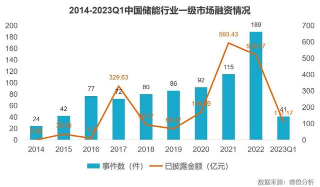 近些年國(guó)內(nèi)一級(jí)市場(chǎng)投融資整體呈現(xiàn)持續(xù)下滑趨勢(shì),但儲(chǔ)能行業(yè)投融資熱度持續(xù)高漲。根據(jù)睿獸分析統(tǒng)計(jì),截至2023年3月31日,國(guó)內(nèi)儲(chǔ)能行業(yè)有300余家企業(yè)獲得融資,涉及融資事件944件、融資金額1947億元,參與機(jī)構(gòu)達(dá)1122家。中國(guó)儲(chǔ)能行業(yè)在2021年、2022年迎來爆發(fā),2022年中國(guó)儲(chǔ)能行業(yè)融資事件189件,同比增長(zhǎng)64.3%,融資金額520.97億元,同比下降12.2%,但仍處于高位。近10年,中國(guó)儲(chǔ)能行業(yè)累計(jì)獲得超1900億元融資。