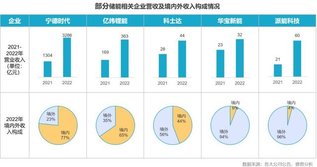 2022年是儲(chǔ)能出海元年,之前海外儲(chǔ)能市場(chǎng)一直被日韓品牌占據(jù),隨著海外儲(chǔ)能市場(chǎng)需求火爆,國(guó)內(nèi)儲(chǔ)能企業(yè)紛紛出海,目前海外儲(chǔ)能市場(chǎng)已經(jīng)成為國(guó)內(nèi)儲(chǔ)能企業(yè)創(chuàng)收貢獻(xiàn)最大的市場(chǎng)。根據(jù)已發(fā)布2022年度報(bào)告的儲(chǔ)能上市企業(yè)數(shù)據(jù),多數(shù)儲(chǔ)能相關(guān)企業(yè)營(yíng)收獲得兩位數(shù)以上增長(zhǎng),其中寧德時(shí)代、億緯鋰能、派能科技等企業(yè)營(yíng)收增長(zhǎng)超過100%;企業(yè)海外市場(chǎng)營(yíng)收增速較快,部分企業(yè)海外市場(chǎng)營(yíng)收占比超過90%,華寶新能、派能科技境外營(yíng)收比重分別達(dá)到94%和96%。