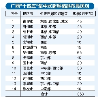 近日,自治區(qū)發(fā)展改革委印發(fā)《廣西新型儲(chǔ)能發(fā)展規(guī)劃(2023—2030年)》(以下簡稱《規(guī)劃》)。從廣西“十四五”集中式新型儲(chǔ)能布局規(guī)劃(見下表)來看,欽州市將建設(shè)65萬千瓦新型儲(chǔ)能,居全區(qū)第一;南寧優(yōu)先在東部、西北部、城區(qū)布局,建設(shè)45萬千瓦新型儲(chǔ)能,建設(shè)規(guī)模和柳州持平,均居全區(qū)第二。