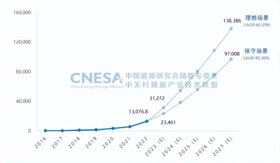 經(jīng)歷“十三五”孕育,“十四五”時(shí)期,我國新型儲(chǔ)能市場(chǎng)有望邁上新臺(tái)階。2021開始,我國新型儲(chǔ)能從商業(yè)化初期向規(guī)模化發(fā)展,根據(jù)CNESA預(yù)測(cè),在未來5年,“新能源+儲(chǔ)能”是新型儲(chǔ)能的主要應(yīng)用場(chǎng)景,政策推動(dòng)將構(gòu)成中國儲(chǔ)能市場(chǎng)的主要增長動(dòng)力;根據(jù)中國能源研究會(huì)儲(chǔ)能專委會(huì)/中關(guān)村儲(chǔ)能產(chǎn)業(yè)技術(shù)聯(lián)盟(CNESA)全球儲(chǔ)能數(shù)據(jù)庫的不完全統(tǒng)計(jì),截至2022年底,國內(nèi)已投運(yùn)的電力儲(chǔ)能項(xiàng)目累計(jì)裝機(jī)達(dá)59.8GW,占全球市場(chǎng)總規(guī)模的25%,年增長率38%,其中新型儲(chǔ)能持續(xù)高速發(fā)展,累計(jì)裝機(jī)規(guī)模首次突破10GW,累計(jì)裝機(jī)規(guī)模首次突破10GW,達(dá)到13.1GW/27.1GWh。未來5年,“新能源+儲(chǔ)能”是新型儲(chǔ)能的主要應(yīng)用場(chǎng)景,政策推動(dòng)是主要增長動(dòng)力;根據(jù)中關(guān)村儲(chǔ)能產(chǎn)業(yè)技術(shù)聯(lián)盟(CNESA)對(duì)我國新型儲(chǔ)能未來5年市場(chǎng)規(guī)模的預(yù)測(cè),保守場(chǎng)景下,預(yù)計(jì)2027年新型儲(chǔ)能累計(jì)規(guī)模將達(dá)到97.0GW,2023-2027年復(fù)合年均增長率(CAGR)為49.3%;理想場(chǎng)景下,預(yù)計(jì)2027年新型儲(chǔ)能累計(jì)規(guī)模將達(dá)到138.4GW,2023-2027年復(fù)合年均增長率(CAGR)為60.3%。預(yù)計(jì)未來5年,年度新增儲(chǔ)能裝機(jī)呈平穩(wěn)上升趨勢(shì)。保守場(chǎng)景下,年平均新增儲(chǔ)能裝機(jī)為16.8GW;理想場(chǎng)景下,年平均新增儲(chǔ)能裝機(jī)為25.1GW。