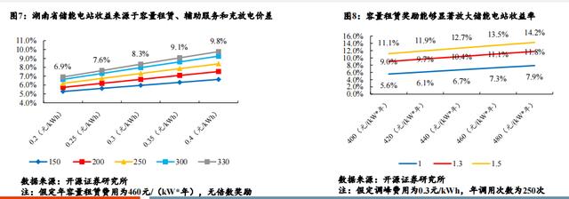 并且在容量租賃獎(jiǎng)勵(lì)為1.3倍和1.5倍時(shí),其資本金收益率能夠放大至11.1%與13.5%??紤]到當(dāng)前湖南省仍存在較大的電 網(wǎng)側(cè)儲(chǔ)能裝機(jī)缺口,調(diào)峰服務(wù)輔助頻次和價(jià)格均有望實(shí)現(xiàn)較大的提升,在不考慮容量租賃獎(jiǎng)勵(lì)的情況下,其資本金收益在年調(diào)用次 數(shù)為330次,調(diào)峰輔助服務(wù)收益為0.4元/kWh的情況下,其資本金收益率能夠達(dá)到9.8%。隨著電力輔助服務(wù)種類增多和電力現(xiàn)貨市場(chǎng) 的開(kāi)展,其收益方式有望進(jìn)一步增加。同時(shí)儲(chǔ)能電站的收益在一定程度上依賴電站運(yùn)營(yíng)商自身的運(yùn)營(yíng)水平,隨著儲(chǔ)能電站運(yùn)營(yíng)商的 經(jīng)驗(yàn)積累,收益能力有望進(jìn)一步提升。