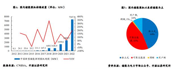 國(guó)內(nèi)儲(chǔ)能裝機(jī)有望持續(xù)增長(zhǎng),表前儲(chǔ)能為裝機(jī)主力。根據(jù)CNESA數(shù)據(jù)統(tǒng)計(jì),2012-2022年間國(guó)內(nèi)新型儲(chǔ)能新增裝機(jī)復(fù)合增 速高達(dá)95%。2022年國(guó)內(nèi)新型儲(chǔ)能新增裝機(jī)高達(dá)7.3GW,同比增長(zhǎng)近200%。就國(guó)內(nèi)儲(chǔ)能裝機(jī)類型分布而言,根據(jù)儲(chǔ)能與 電力市場(chǎng)公眾號(hào)統(tǒng)計(jì),可再生能源配儲(chǔ)與獨(dú)立儲(chǔ)能裝機(jī)占比分別為45%與44%,用于調(diào)頻的裝機(jī)占比僅為1%,工商業(yè)用 戶側(cè)儲(chǔ)能裝機(jī)占比10%。我國(guó)當(dāng)前的儲(chǔ)能類型主要還是以用于配套新能源裝機(jī)的表前儲(chǔ)能裝機(jī)為主。