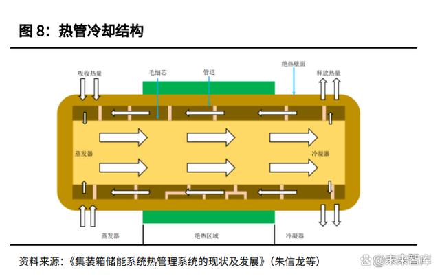 相變材料和熱管冷卻仍處于在研階段,成本和穩(wěn)定性是影響其投產(chǎn)的重要原 因。相變材料冷卻是使電池單體直接接觸相變材料,利用其相變過程吸收熱 量實(shí)現(xiàn)對鋰離子電池的冷卻。相變材料冷卻可以明顯提升儲能系統(tǒng)溫度分布 的均勻性,但其價(jià)格較高,且當(dāng)相變材料吸熱時(shí),其體積變化明顯,容易對 儲能系統(tǒng)的工作性能產(chǎn)生影響。熱管是一種利用介質(zhì)在吸熱端的蒸發(fā)帶走熱 量,再在放熱端通過冷凝的方式將熱量傳遞到外界的裝置,這一冷卻技術(shù)已 相對成熟,但其成本較高,在手機(jī)等電子設(shè)備上使用較多,應(yīng)用于儲能系統(tǒng) 上性價(jià)比低。