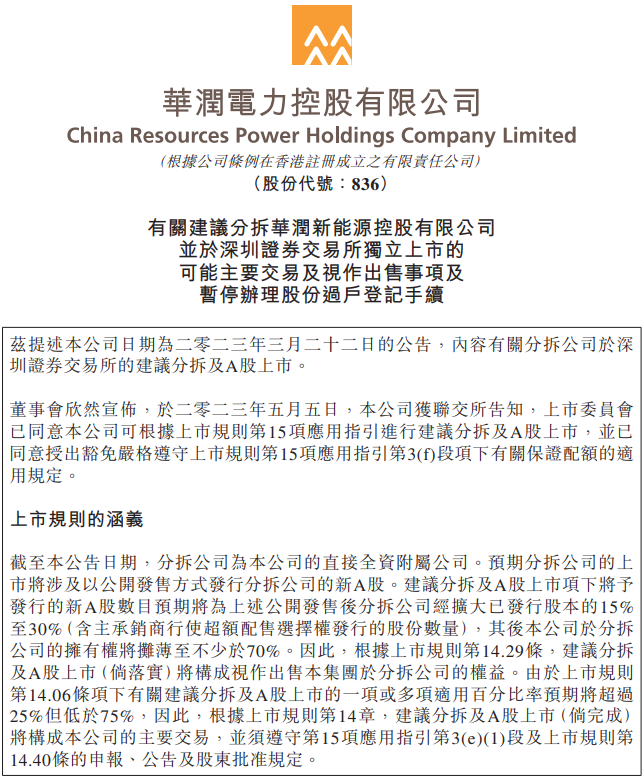 6月18日,華潤電力發(fā)布《有關建議分拆華潤新能源控股有限公司并于深圳證券交易所獨立上市的可能主要交易及視作出售事項及暫停辦理股份過戶登記手續(xù)》。