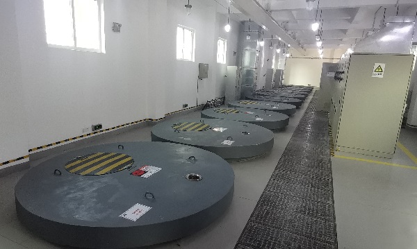 距離儲(chǔ)能電站不遠(yuǎn)的飛輪儲(chǔ)能項(xiàng)目,是國(guó)內(nèi)首個(gè)投入運(yùn)行的與百萬(wàn)千瓦級(jí)中間二次再熱火電機(jī)組聯(lián)合調(diào)頻項(xiàng)目,也是國(guó)內(nèi)首個(gè)室內(nèi)飛輪儲(chǔ)能項(xiàng)目。記者在廠房看到,10個(gè)直徑2米左右的井蓋依次排列,打開(kāi)地井就看到了外形類似豎立大桶的磁懸浮飛輪儲(chǔ)能裝置。
