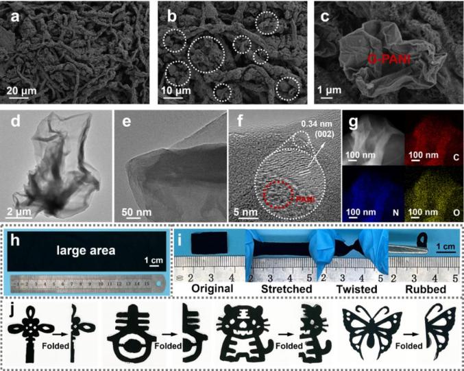 圖2(d-g)為G-PANI織物的透射電鏡照片,顯示出苯胺成功將GO還原為RGO。通過(guò)離心靜電紡絲可以實(shí)現(xiàn)超過(guò)90 cm2 G-PANI@pcPU織物的大規(guī)模制備(圖2h)。