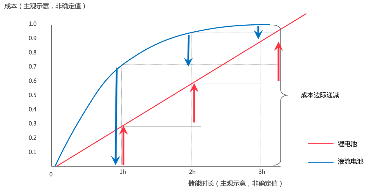 相較動(dòng)輒發(fā)生安全事故的鋰電池,液流電池不燃燒、不爆炸,本征安全優(yōu)勢突出。其儲能時(shí)長大于2小時(shí),使用壽命超過20年,循環(huán)次數(shù)超過15000次等優(yōu)勢,更適合未來大量使用新能源的電網(wǎng),也被視為最適合長時(shí)儲能的電池技術(shù)之一。并且,隨著儲能時(shí)長的增加,液流電池的投資成本邊際遞減。