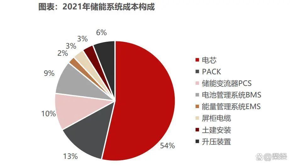 從儲(chǔ)能系統(tǒng)的構(gòu)成來(lái)看,儲(chǔ)能電池組最為主要的構(gòu)成部分是——電芯,占據(jù)儲(chǔ)能電池的比例約為80%。那么“電芯”和“PACK”分別占儲(chǔ)能系統(tǒng)的54%、13%。