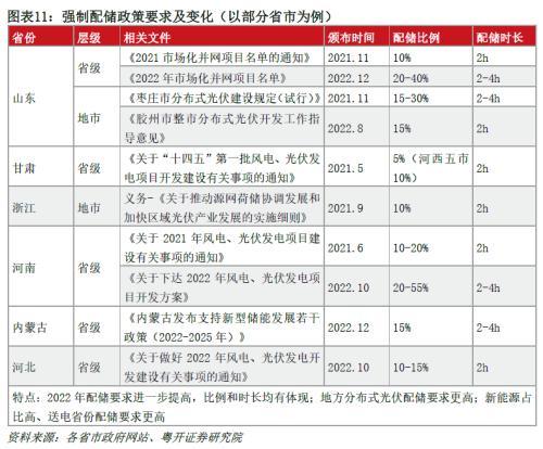 強(qiáng)制配儲(chǔ)政策客觀上拉動(dòng)儲(chǔ)能裝機(jī)需求。2021年2月,國(guó)家發(fā)改委、能源局出臺(tái)《關(guān)于推進(jìn)電力源網(wǎng)荷儲(chǔ)一體化和多能互補(bǔ)發(fā)展的指導(dǎo)意見(jiàn)》,明確增量風(fēng)光儲(chǔ)一體化要優(yōu)化配套儲(chǔ)能規(guī)模,充分發(fā)揮儲(chǔ)能調(diào)峰、調(diào)頻作用。5月出臺(tái)的《關(guān)于2021年風(fēng)電、光伏發(fā)電開(kāi)發(fā)建設(shè)有關(guān)事項(xiàng)的通知》也指出保障性并網(wǎng)以外的項(xiàng)目,需通過(guò)自建、合建共享或購(gòu)買(mǎi)服務(wù)等市場(chǎng)化方式落實(shí)并網(wǎng)條件后并網(wǎng)。自此,多地相繼發(fā)布電源側(cè)風(fēng)光強(qiáng)制配儲(chǔ)政策,多要求10%/2h的配置比例和時(shí)長(zhǎng),并且政策要求逐漸向15-30%和4-5h的高比例、長(zhǎng)時(shí)儲(chǔ)能發(fā)展。事實(shí)上,多地風(fēng)光項(xiàng)目招標(biāo)競(jìng)爭(zhēng)過(guò)程中,實(shí)際配儲(chǔ)情況高于政策要求。