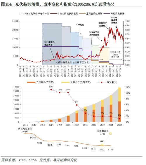 3、具體來(lái)看:1)風(fēng)電呈現(xiàn)周期性行情:三上漲與兩回調(diào)交錯(cuò),對(duì)應(yīng)行業(yè)擴(kuò)張與嚴(yán)監(jiān)管交替。風(fēng)電周期性行情與行業(yè)供需均衡情況相匹配,行業(yè)快速擴(kuò)張或增速放緩背后的原因在于政策引導(dǎo)或限制需求,復(fù)盤(pán)風(fēng)電發(fā)展和指數(shù)表現(xiàn),我們發(fā)現(xiàn)風(fēng)電行情周期大約在5年左右,每2-3年進(jìn)行一次峰谷切換。2)光伏“四上一下”行情:規(guī)劃、補(bǔ)貼和需求是驅(qū)動(dòng)因素。單復(fù)盤(pán)光伏指數(shù)走勢(shì),光伏1-2年出現(xiàn)一波行情,但結(jié)合行業(yè)監(jiān)管和企業(yè)出清來(lái)看,光伏產(chǎn)業(yè)發(fā)展和行情周期仍為5年左右,期間受補(bǔ)貼退坡等事件驅(qū)動(dòng),指數(shù)出現(xiàn)階段性行情。