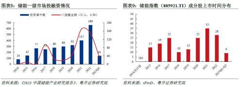 從儲(chǔ)能公司投融資角度來(lái)看,近兩年儲(chǔ)能一級(jí)和二級(jí)市場(chǎng)投融資熱度高漲。不完全統(tǒng)計(jì)數(shù)據(jù)顯示,截至2023年一季度,300余家儲(chǔ)能企業(yè)獲得融資,涉及投融資事件900余件、已披露融資金額近2000億元。其中,2021年儲(chǔ)能披露融資金額近600億元,2022年儲(chǔ)能行業(yè)全年融資189次。二級(jí)市場(chǎng)方面,近三年儲(chǔ)能相關(guān)公司IPO多達(dá)97家,占儲(chǔ)能指數(shù)(885921.TI)比重達(dá)24.8%,此外也有部分上市公司于近些年實(shí)現(xiàn)儲(chǔ)能業(yè)務(wù)的突破和轉(zhuǎn)型。