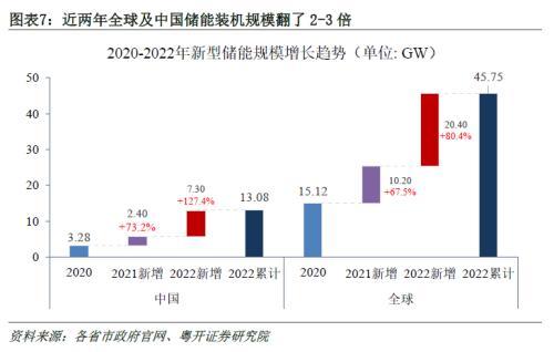 2021年以來(lái)全球儲(chǔ)能行業(yè)快速發(fā)展,尤其是中國(guó)儲(chǔ)能裝機(jī)規(guī)模飛速增長(zhǎng),單年新增規(guī)模均超過(guò)上年累計(jì)總裝機(jī)規(guī)模,截至2022年底中國(guó)新型儲(chǔ)能裝機(jī)規(guī)模13.08GW,占全球新型儲(chǔ)能裝機(jī)的28.6%,較2020年底中國(guó)累計(jì)裝機(jī)提高298.8%。