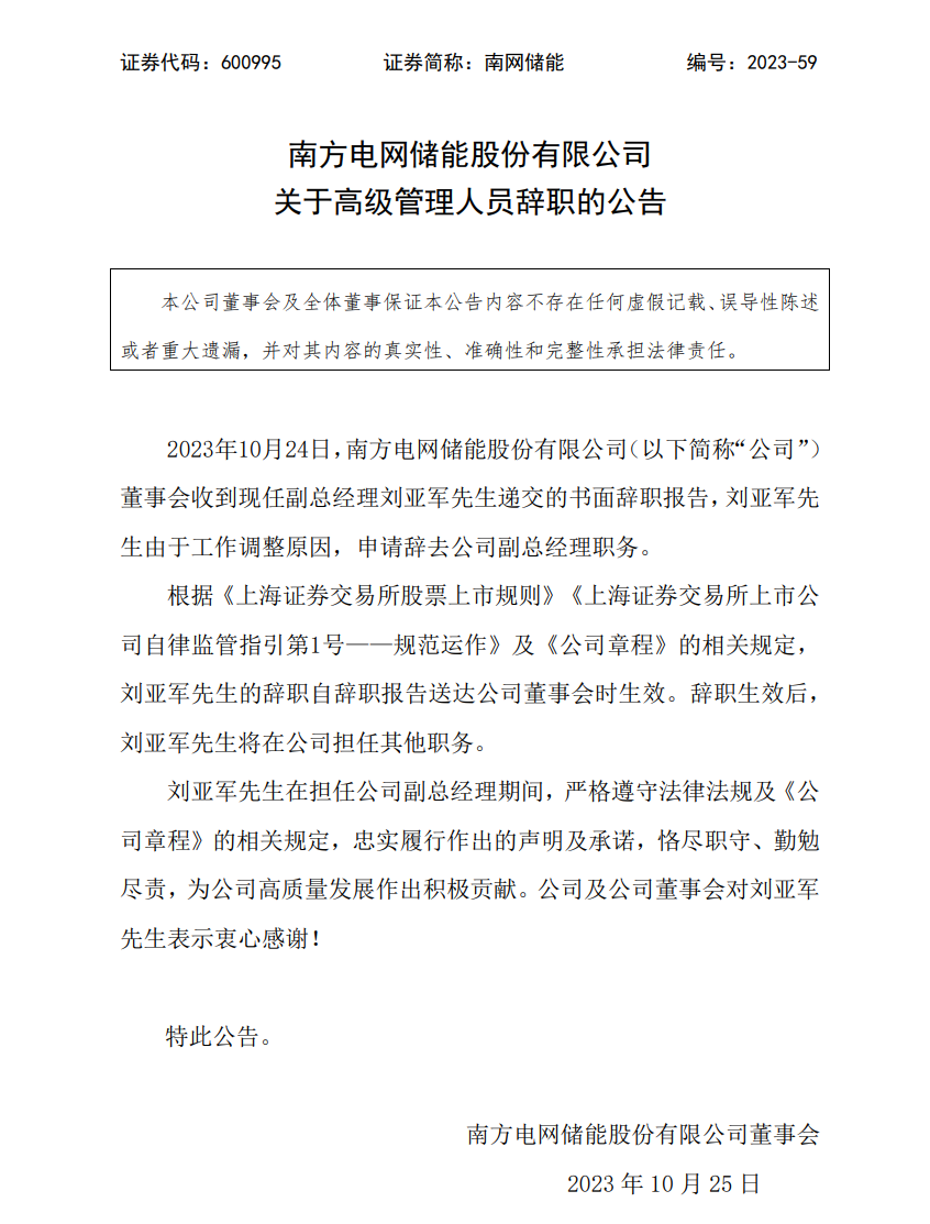 南網(wǎng)儲(chǔ)能公告稱,10月24日,公司董事會(huì)收到現(xiàn)任副總經(jīng)理劉亞軍先生遞交的書面辭職報(bào)告,劉亞軍先生由于工作調(diào)整原因,申請(qǐng)辭去公司副總經(jīng)理職務(wù)。