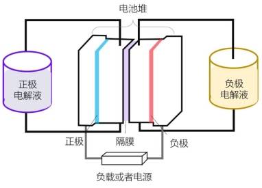 液流電池作為電化學(xué)儲能技術(shù)之一,其將陰陽極電解液分別通過管路推入電堆中,通過活性元素的價態(tài)變化,在電能和化學(xué)能之間產(chǎn)生轉(zhuǎn)換來實現(xiàn)充放電。由于液流電池是將能量儲存于水性電解液中,且能量轉(zhuǎn)化不依賴于固體電極,因此沒有燃燒爆炸的風(fēng)險,符合儲能的安全需求。