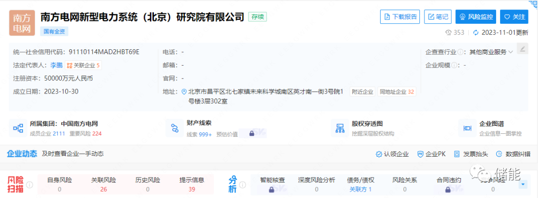 10月30日,南方電網(wǎng)新型電力系統(tǒng)(北京)研究院有限公司注冊(cè)成立,法定代表人為李鵬,注冊(cè)資本5億元人民幣,該公司由中國(guó)南方電網(wǎng)有限責(zé)任公司及旗下南方電網(wǎng)數(shù)字電網(wǎng)集團(tuán)有限公司、南方電網(wǎng)科學(xué)研究院有限責(zé)任公司共同持股。