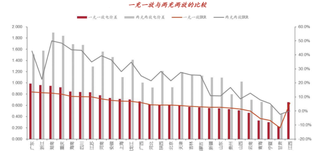 經(jīng)濟(jì)性分析:我們以容量1MWh、循環(huán)次數(shù)為6000次的儲(chǔ)能系統(tǒng),浙江的峰谷電價(jià)為例,假設(shè)年運(yùn)行天數(shù)為300天,單位投資為1.58元/Wh,充放電深度為90%,充、放電效率均為92%,考慮業(yè)主完全自建模式,不考慮資金成本,2充2放下(實(shí)際充放電次數(shù)假設(shè)為1.5),計(jì)算得IRR為22%,投資回收期為4.5年,儲(chǔ)能LCOS為0.49元/kWh。1充1放下,計(jì)算得IRR為8.86%,投資回收期為13年,儲(chǔ)能LCOS為0.72元/kWh。