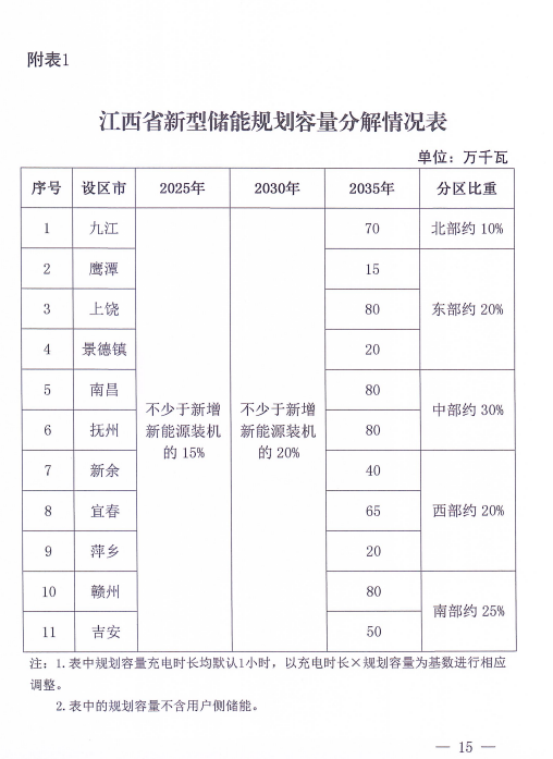 《發(fā)展規(guī)劃》制定了江西省分階段的儲能發(fā)展目標:到2025年、2030年,力爭實現(xiàn)各設(shè)區(qū)市新型儲能投產(chǎn)規(guī)模不少于新增新能源裝機的15%和20%。到2035年,力爭實現(xiàn)全省新型儲能投產(chǎn)600萬千瓦以上。