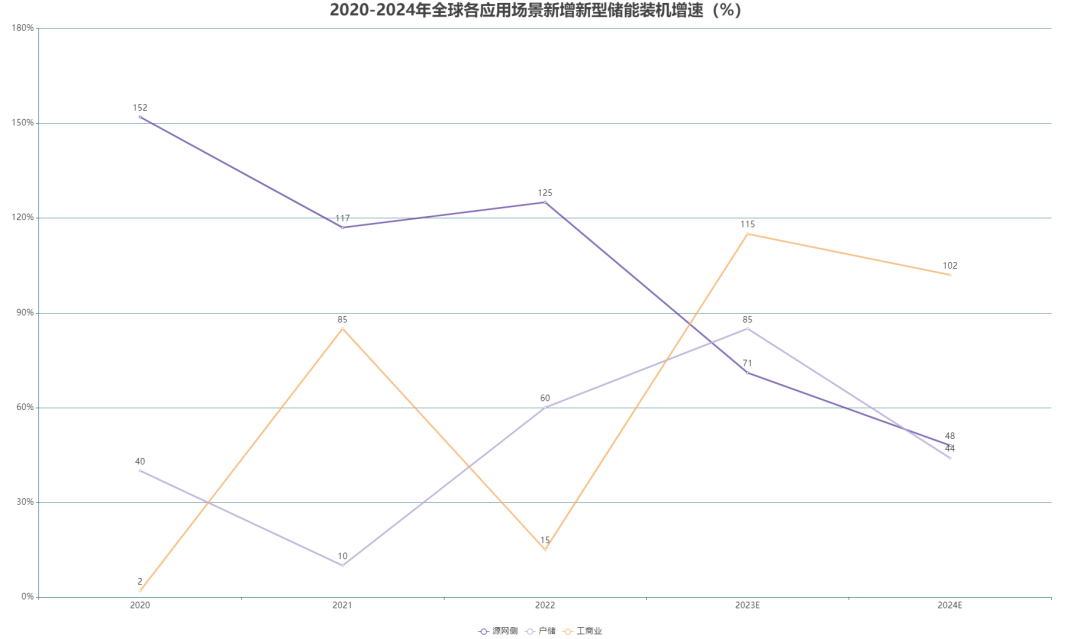 從裝機增速來看,工商業(yè)儲能也有著亮眼的表現(xiàn)?!?024年全球儲能行業(yè)趨勢預測報告》數(shù)據(jù)顯示,2023年全球工商業(yè)新型儲能裝機同比增速超過源網(wǎng)側和戶儲端,達到了115%。