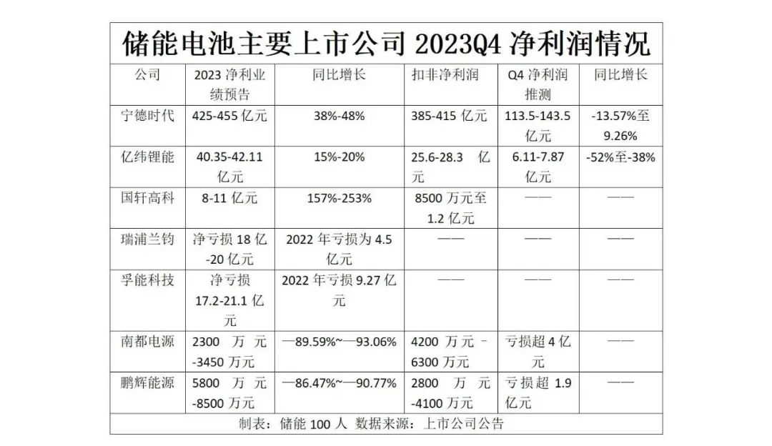 從鋰電儲能電池上市公司公布的業(yè)績預告來看,2023年四季度凈利潤普遍增速放緩或下滑。寧德時代雖然日賺過億,但第四季度的凈利潤有可能出現(xiàn)同比下滑的情況。