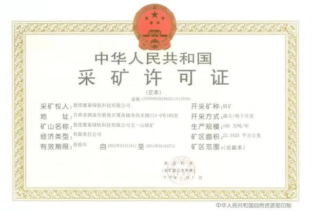 此次獲得開采權(quán)的礦山名稱為敦煌寰泰綠釩科技有限公司五一山釩礦,有效期限三十年,開采礦種為釩礦,礦床規(guī)模為中型,開采規(guī)模為180萬噸/年,礦區(qū)面積為22.5425平方公里。