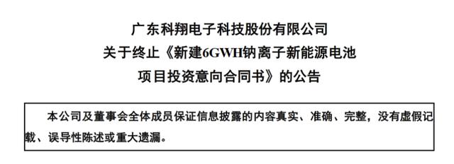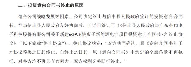 據(jù)科翔股份董秘辦的工作人員回應稱,這是公司根據(jù)發(fā)展情況做出的決定,也表示公司還在繼續(xù)做鈉離子電池,后續(xù)應該會披露進展。信豐縣的終止項目是意向協(xié)議,而與大亞灣簽訂的是正式協(xié)議。