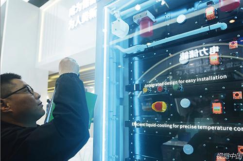 2024年3月11日,杭州,觀眾在中國國際儲能大會參觀億緯鋰能的液冷儲能設施。