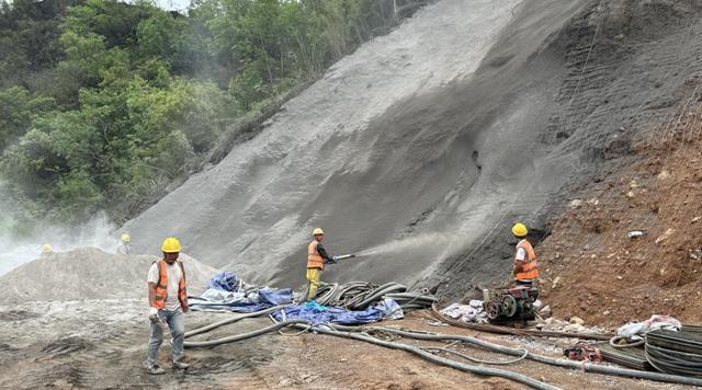 現場工人正在進行修筑邊坡。李蔓毓 攝