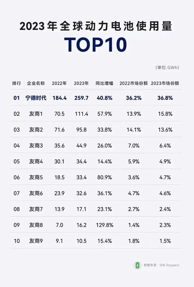 事實上,寧德時代評級之所以能夠獲得上調(diào),與其市場份額的持續(xù)提升不無關(guān)系?!?023年全球動力電池使用數(shù)據(jù)》顯示,2023年寧德時代動力電池使用量達259.7GWh,相較2022年增長40.8%,市場占有率高達36.8%,穩(wěn)居世界第一,比第二名高出近21個百分點。