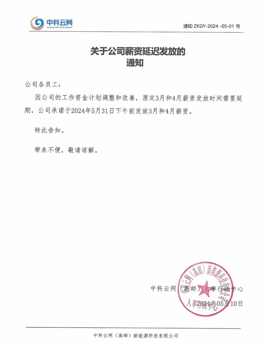 證券時報·e公司記者注意到,近日,有網(wǎng)友通過社交平臺發(fā)布了中科云網(wǎng)(高郵)新能源科技有限公司(下稱“中科高郵”)拖欠員工工資并放假的消息。