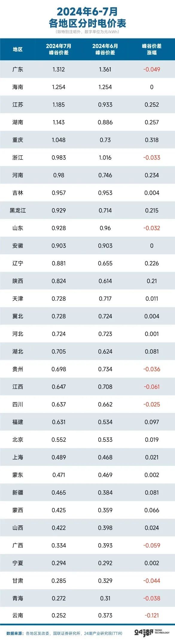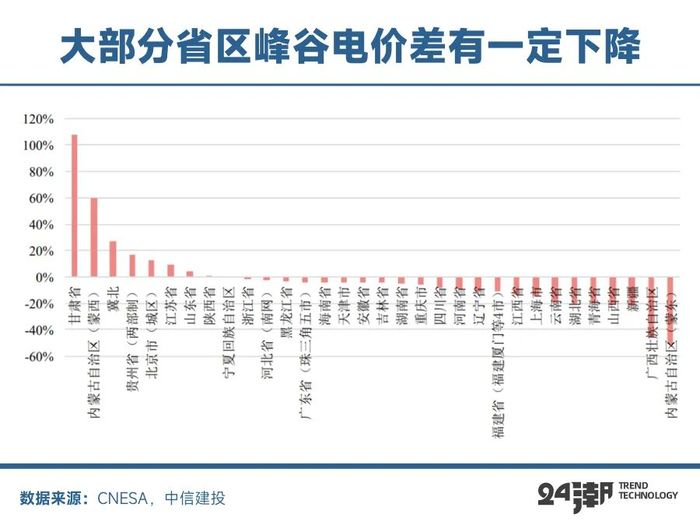 這并非危言聳聽,根據(jù)東海證券統(tǒng)計,今年以來浙江、河南、江蘇多地發(fā)布分時電價調(diào)整政策,全國范圍內(nèi)峰谷電價差縮窄趨勢顯著,河南省分時電價調(diào)整新政亦正式落地。此外根據(jù)中關村儲能聯(lián)盟對32個省區(qū)的分析,今年1-8月份一般工商業(yè)1-10kV電網(wǎng)代理購電最大峰谷價差平均為0.68元/kWh,較2023年同比下降了6.7%。與2023年1-8月相比,今年各地最大峰谷價差普遍呈現(xiàn)下降趨勢,僅甘肅、蒙西、冀北等8個地區(qū)價差有所提高,其他地區(qū)均為下降。