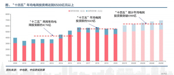 南方電網(wǎng)在“十四五”期間的計(jì)劃是總投約6700億元,較“十三五”總投資增長約22%。兩者合計(jì)總投資就高達(dá)2.9萬億元,如果算上地區(qū)電網(wǎng)公司,“十四五”期間全國電網(wǎng)總投資預(yù)計(jì)達(dá)到3萬億元。