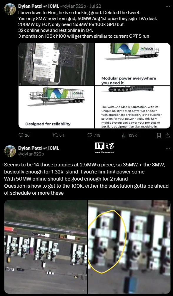 AI 和半導(dǎo)體分析師 Dylan Patel 最初在社交媒體上表示,由于電力限制,馬斯克的孟菲斯超級(jí)計(jì)算集群可能無(wú)法運(yùn)行。他指出,目前僅從電網(wǎng)抽取了 7 兆瓦電力,只能支持約 4000 個(gè) GPU 運(yùn)行。田納西河谷管理局(TVA)將在 8 月 1 日之前向該設(shè)施提供 50 兆瓦電力,前提是 xAI 能簽署相關(guān)協(xié)議。Patel 還觀察到,xAI 場(chǎng)地的 150 兆瓦變電站仍在建設(shè)中,預(yù)計(jì)將于 2024 年第四季度完工。