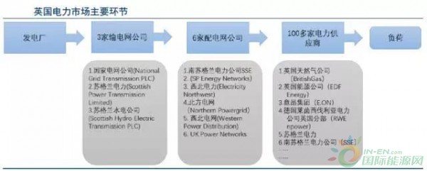 整個英國由3家輸電網(wǎng)公司負責(zé)區(qū)域性輸電網(wǎng)絡(luò)。在配電網(wǎng)層面,英國被劃分為14個區(qū)域并由6大配電網(wǎng)公司(DNOs)運營。配電公司作為獨立于輸電和售電環(huán)節(jié)的中間人,通過運作其擁有的配電網(wǎng)絡(luò)將輸電網(wǎng)傳輸?shù)碾娏Ψ峙浣o民用和工商業(yè)用戶。但是配電公司并不參與售電的環(huán)節(jié)。與發(fā)電、輸電和配電公司不同的是,英國電力供應(yīng)商被定義為支付配電網(wǎng)絡(luò)費用并從電力批發(fā)市場中購買電力,再以一定價格出售給自己顧客的商業(yè)實體。