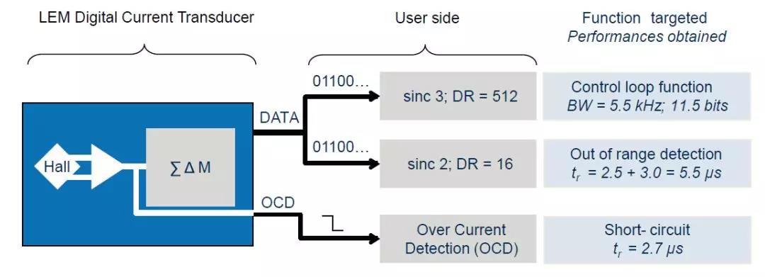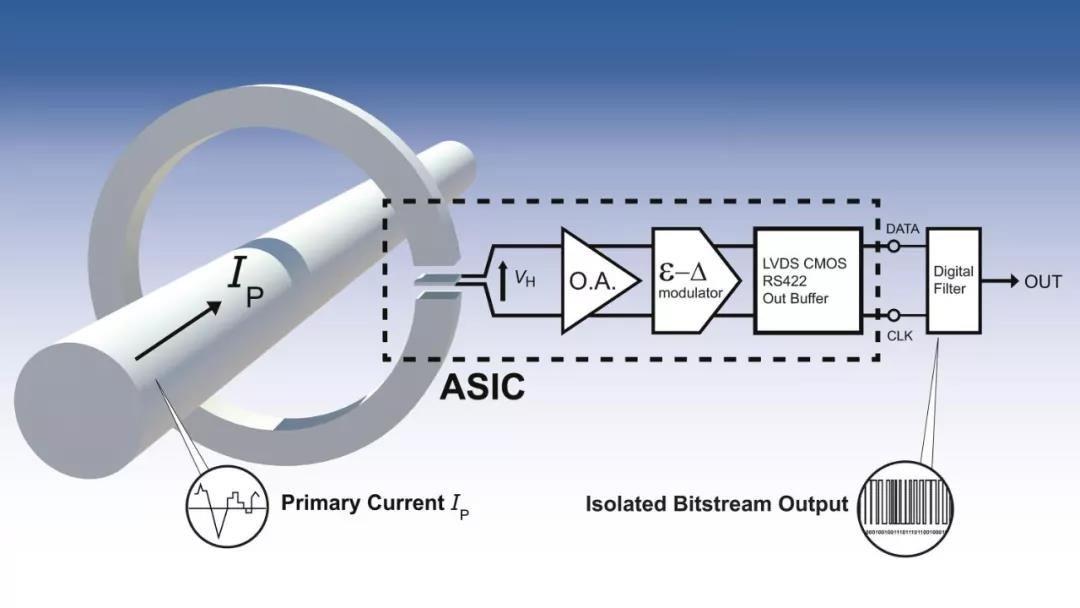 LEM公司針對(duì)數(shù)字化的市場(chǎng)需求,在經(jīng)典開環(huán)傳感器的基礎(chǔ)上基于∑-△ ADC的技術(shù),開發(fā)出了一系列的先進(jìn)數(shù)字輸出傳感器。其基本原理如圖1所示。